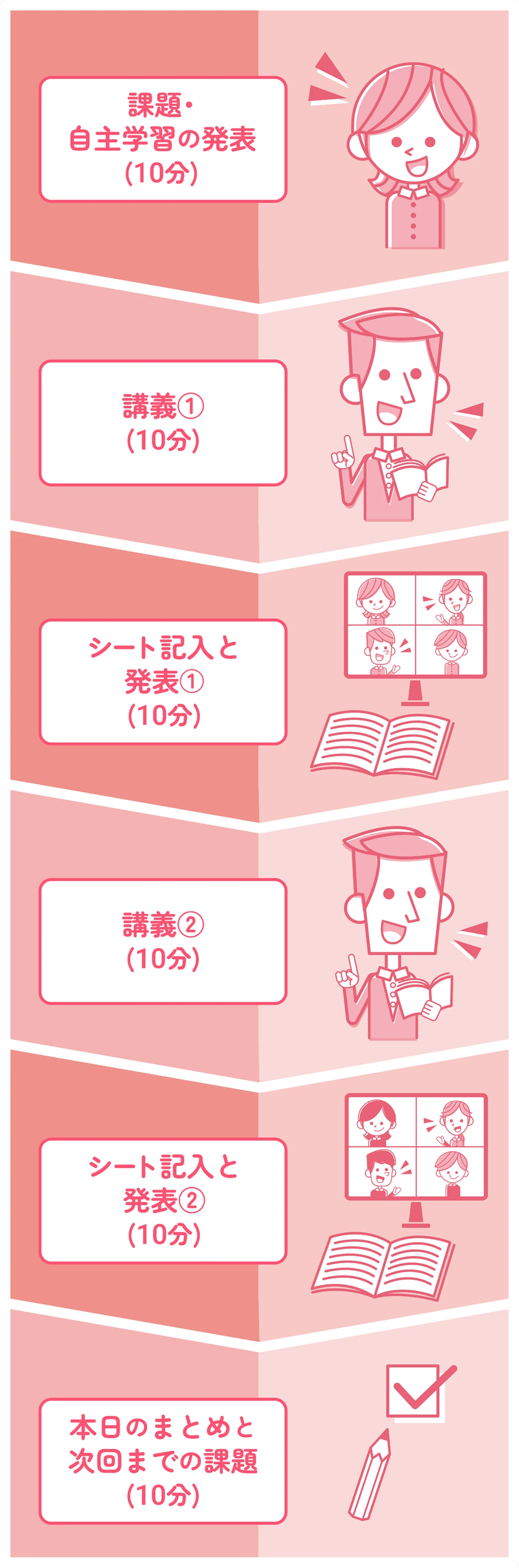 1回の授業では【講義】と【まとめ・ディスカッション】に取り組みます。(60分の例)